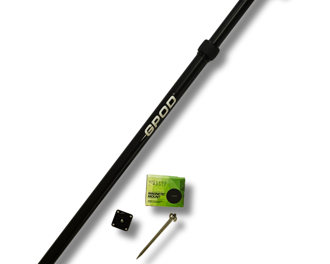 Iphone attached to the gpod mini clamped onto an alignment stick for the purpose of filming a golf swing. The phone is attached magnetically.